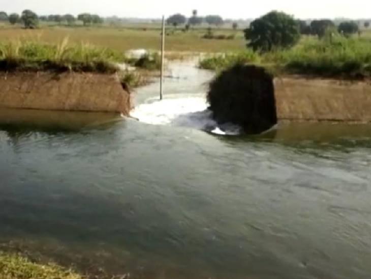 चूहों ने कुतर दी नहर की मिट्टी:रीवा में बाणसागर नहर की फूटी, किसानों के खेतों में घुसा पानी, धान की फसल नुकसान होने की आशंका, बढ़ौआ नाला से निकाला जा रहा पानी